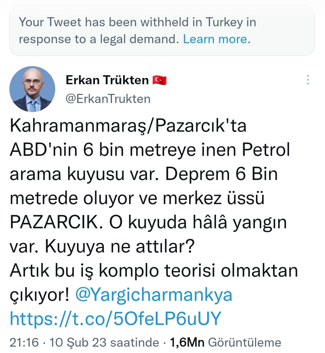 Sansür uygulanan tweet metni şu şekildeydi: Kahramanmaraş/Pazarcık’ta ABD’nin 6 bin metreye inen Petrol arama kuyusu var. Deprem 6 Bin metrede oluyor ve merkez üssü PAZARCIK. O kuyuda hala yangın var. Kuyuya ne attılar? Artık bu iş komplo teorisi olmaktan çıkıyor.”